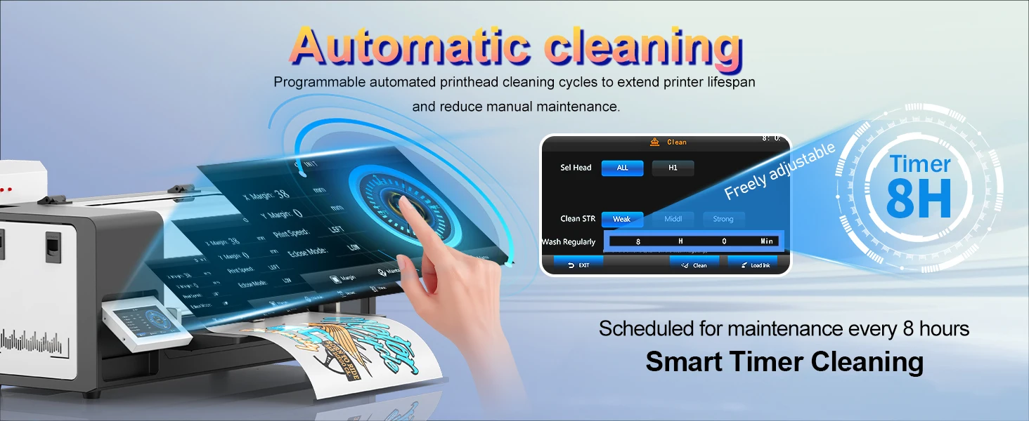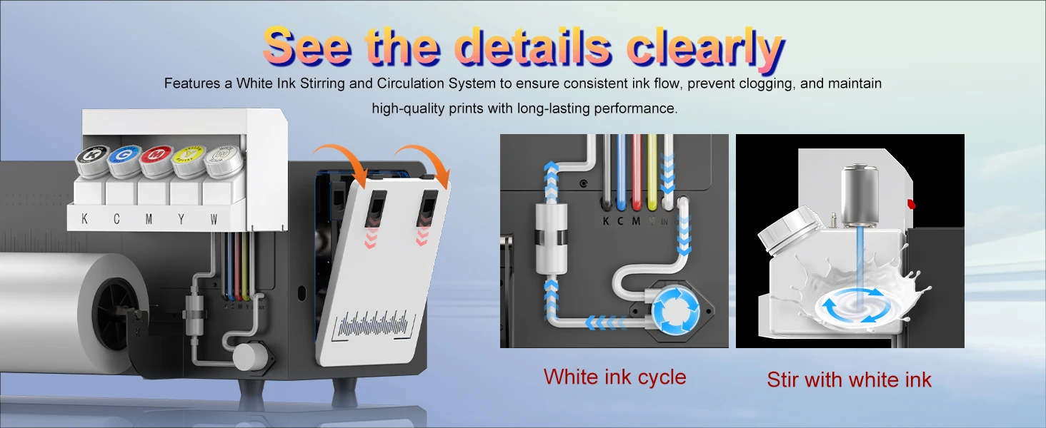 | 1.Anti-clogging design | White ink circulation and mixing + scheduled automatic cleaning provide dual protection to eliminate clogging issues. |