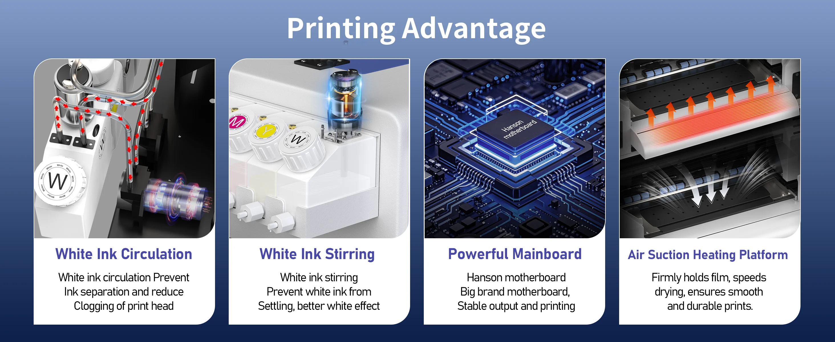 | White Ink circulation | Prevent ink separation and reduce clogging of printer head |