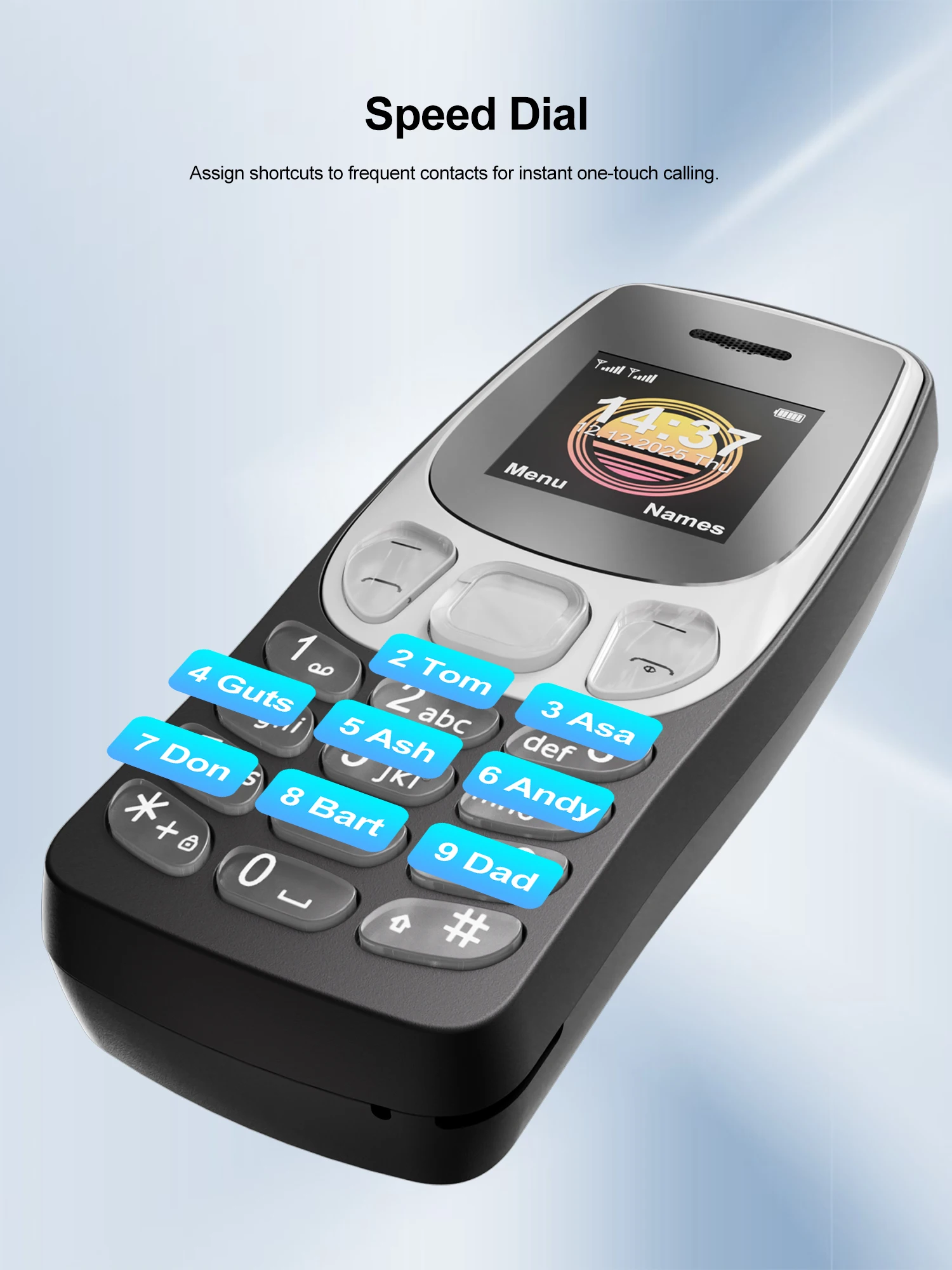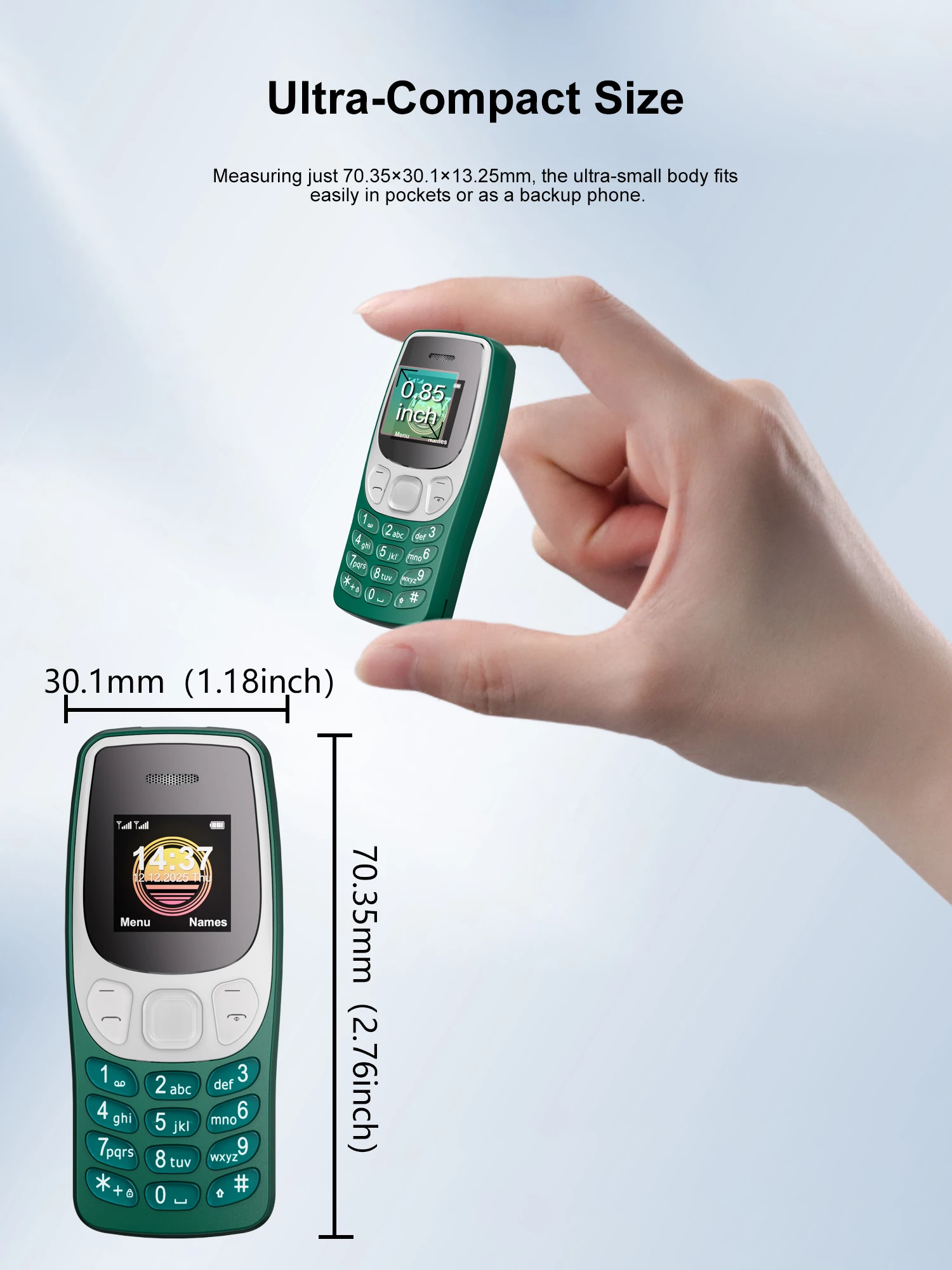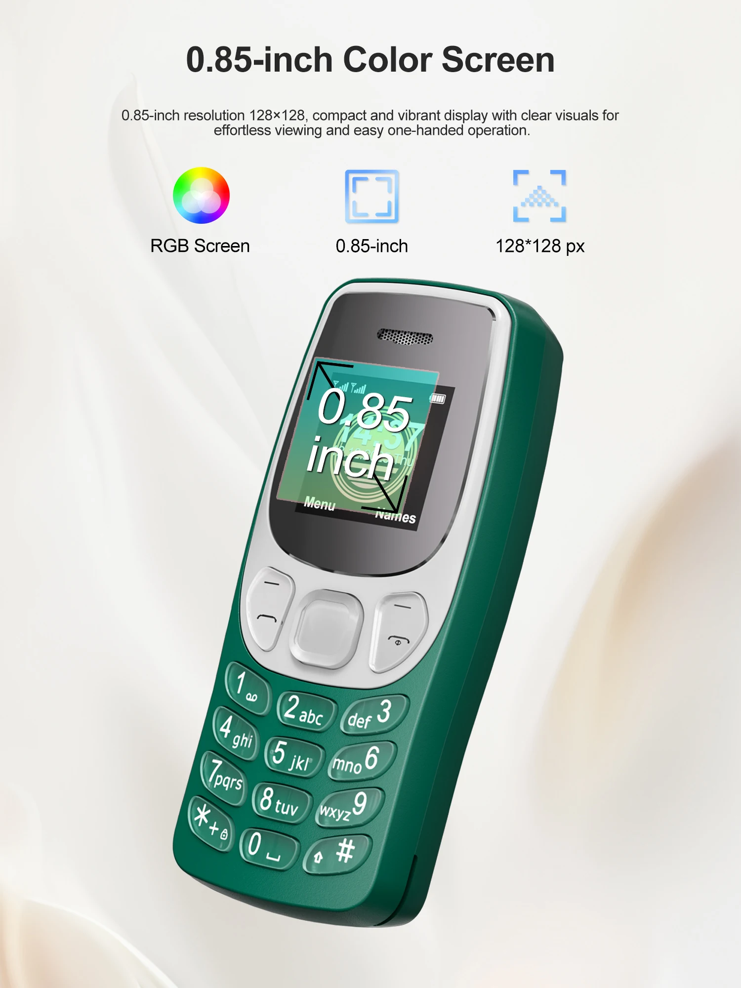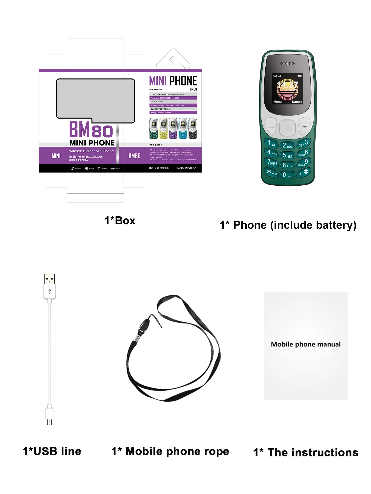 | Model | BM80Size:70.35*30.1*13.25mmScreen Size : 0.85 inch 128*128 ScreenCPU : MTK6261DSIM Card Quantity : 2 SIM Card ( 2 Nano SIM card+1 TF Card)Weight : 25gPhonebook : 500Message : SMSInput : KeypadBattery : 350mAhCharging Interface Type : TYPE-CShell Material : PlasticBluetooth :SupportMemory Card : 32Mb RAM,32Mb ROM(Maximum support 32GB expansion ,The system will occupy part of the memory,It is recommended to install a memory card before using the phone)WiFi : NoMobile system : Non smartphone operat |