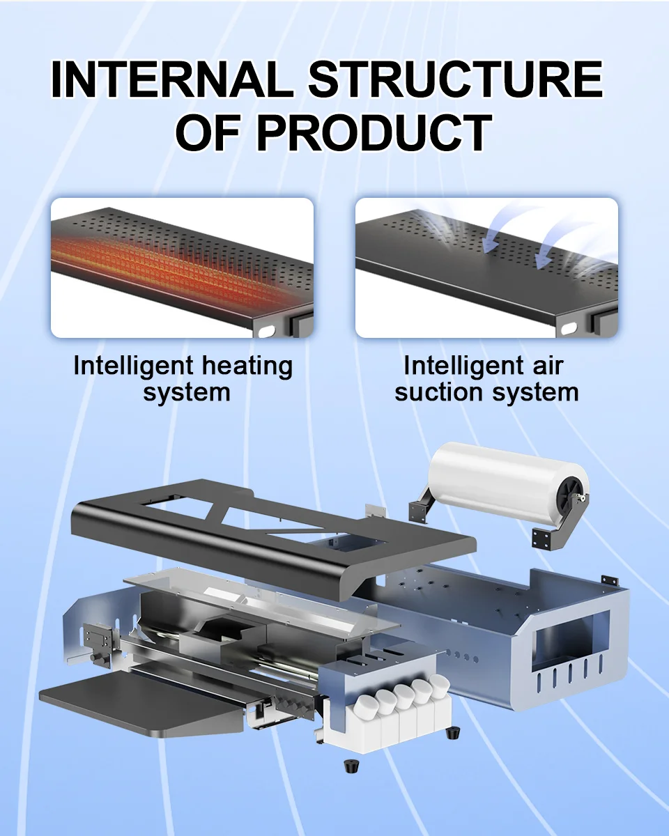 The post-printing heating module cures ink immediately, preventing smudging and ensuring clean, easy powder shaking. The suction platform secures the DTF film flat, preventing edge lifting that can scratch or damage the delicate print head. Our upgraded mainboard protection circuit acts as a safety barrier, avoiding costly motherboard failures during manual cleaning.
